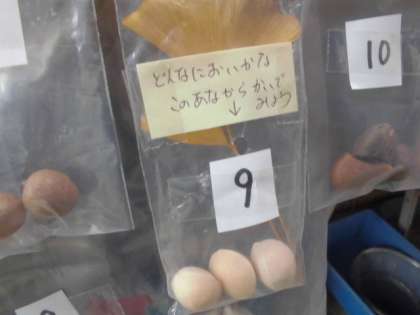 ギンナンは袋に穴が。匂いを嗅ぐ子の反応が素直でよいです。