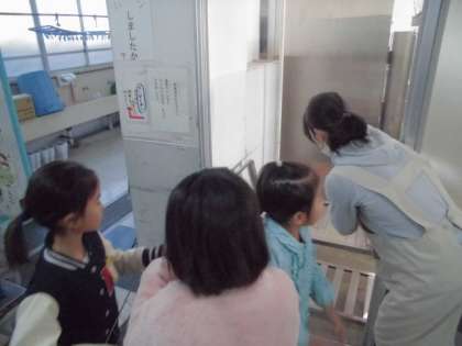 給食室では,給食調理員や栄養教諭も子どもたちの返却を迎えてくれます。
