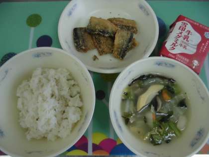 1月11日の献立は「麦ごはん・さんまのカレーあげ・肉片湯」でした。「肉片湯」は「ローペンタン」と読み,中国料理の一つで,うす切りの肉の入ったスープです。「湯」が「スープ」をさしています。豚肉・にんじん・はくさい・小松菜・たけのこ・干ししいたけと具だくさんで,豚肉はしょうがや料理酒・濃口しょうゆで下味をつけてから,かたくり粉をまぶしてからスープに入れるので,つるっとした食感になります。