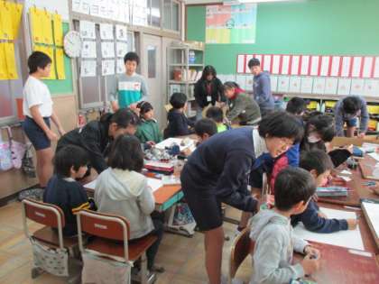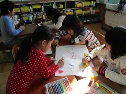 各グループで決めたお店の準備をしています。「コイン落とし」や「宝さがし」,「シルエットクイズ」や「さかなつり」など,色々,楽しいお店を考えています。グループで分担して,看板をかいたり,ゲームを作ったりしています。