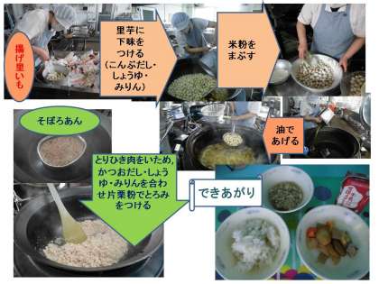 揚げ里いものあんかけは,昨年度に続き2度目の登場で,こぶだしとしょうゆ・みりんで下味をつけた里いもに米粉をつけ,油で揚げたものに,鶏ひき肉のそぼろあん(鶏ひき肉とかつお節のだしとしょうゆ・みりん・かたくり粉)をかけて食べるおかずで,2種類のだしをとったり,油で揚げたり,手の込んだ調理でした。