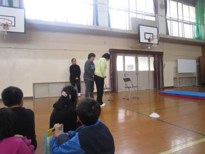 お話を伺った後に,実際に自分たちも視覚障害のある方の気持ちになれるよう,アイマスク・手引き体験を体育館にて行いました。手引きをするときのポイントを教わり,バスで座る場面や,段差,細い道など様々なシーンを想定して体験をしました。「アイマスクをつけて歩くのはもちろんだけど,手引きをするのも怖かった。」,「ただ座るだけなのにこんなにドキドキするなんて!」と,緊張しながら友達を誘導していました。