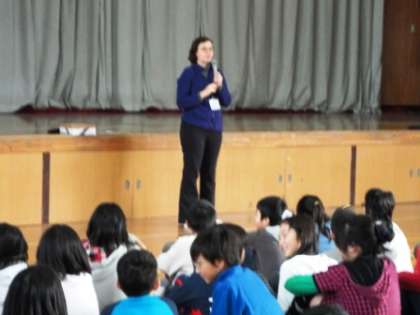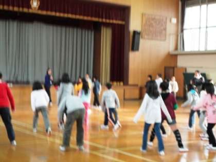 今日は,体育館で5年生全員がALTのジェニー先生の授業を受けました。