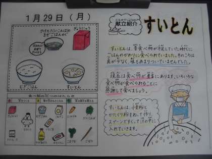 給食のすいとんは具だくさんですが,食べ物が不足していた頃にごはんのかわりに食べられていた料理です。今日は,鶏肉・ごぼう・にんじん・小松菜の入った汁の中に小麦粉と片栗粉・塩をねって作ったものをスプーンで一つ一つすくって入れて入れて作りました。