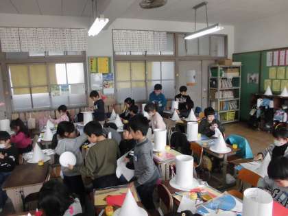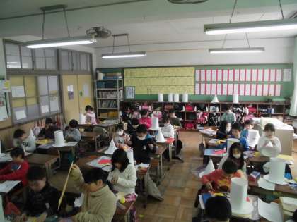 国語科の「ミリーのすてきなぼうし」の学習を活かして想像力を働かせてそれぞれの帽子を作っています。