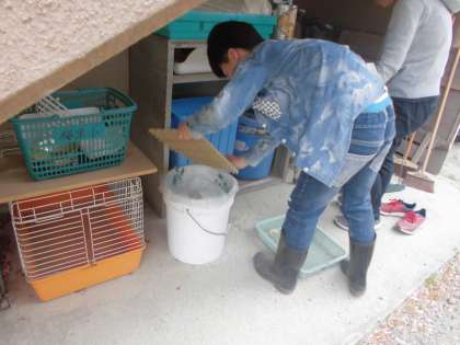 飼育委員会の子どもたちが,お休みにも関わらず,うさぎの飼育にきています。