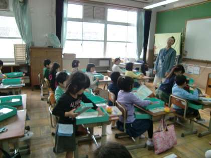 お道具箱の使い方を学びます。右の引き出しには,教科書やノートを入れます。左の引き出しには,クーピーやのりを入れます。小学校で学ぶ1番最初の学習です。みんな,一生懸命引き出しを整理しています。頑張れ!1年生!