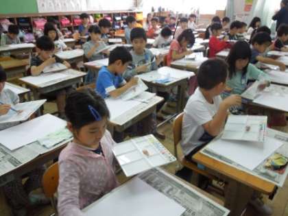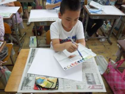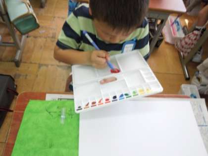 今日の図工の時間は,絵の具道具の使い方や色の作り方や塗り方を学習しました。