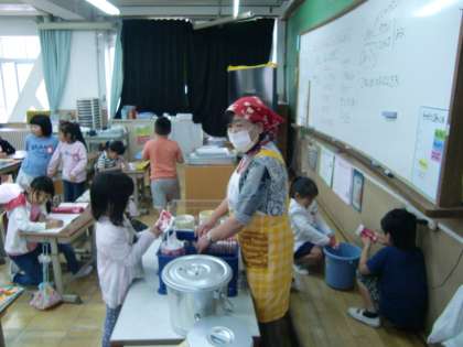美味しい給食をみんなもりもり食べています。食べ終わったらお片付け!