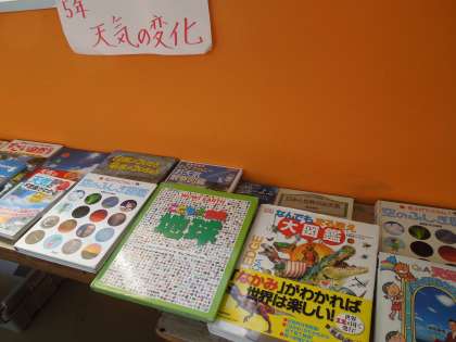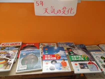 5年生は,最初の「天気の変化」の単元で,実際に雲の様子を見て天気との関係を考えた後,気づいたことなどを本を使って調べています。図書館で調べることもしましたが,必要な本を5年生の廊下に取り出して続けて調べられるようにしています。