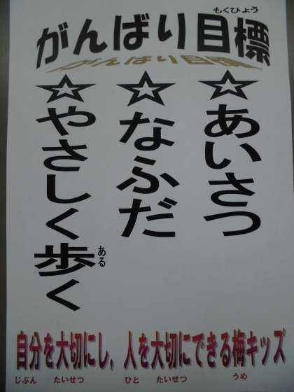 この目標には,「自分を大切にし,人を大切にできる梅キッズになってほしい」と言う願いがこめられています。誰もが楽しい毎日を送るために,梅キッズ&梅テーチャー心を合わせて頑張っていきます!