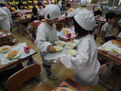 1年生も給食にも慣れ,給食当番も手際よく上手になってきています。エプロンを着るところから,給食台をふきんでふく,協力して教室まで給食を運ぶ,ごはんをしゃもじでよそう,パンをパンばさみではさんで皿に盛る,おかずを同じくらいの量ずつよそう,お盆にのせて運んで配る,エプロンをぬいでたたむ等,いろいろと工夫しながらテキパキとこなしています。