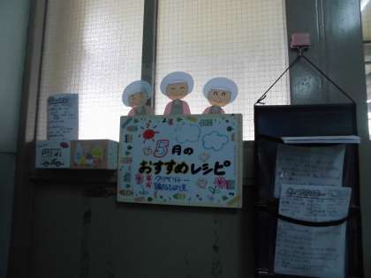 給食室には,調理員さん手書きのレシピのコーナーがあります。今月は「鶏肉のさっぱり煮(10日)」と「クーブイリチー(17日)」を用意しています。前月分ももらえるようにしていて,当番で返しに来た後,選んでもらっていっています。