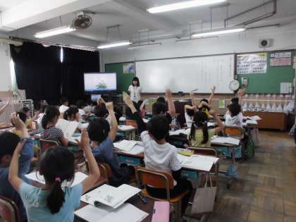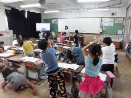 今日は,たんぽぽの軸が倒れていく様子について考えました。子どもたちがたんぽぽになって,軸が倒れていく様子を体現しました。