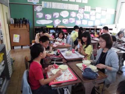 交流給食の様子です。食べながら,さまざまな会話を楽しみます。とてもいい雰囲気です。それにしても,みんなよう食べるし,ようしゃべる!