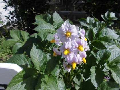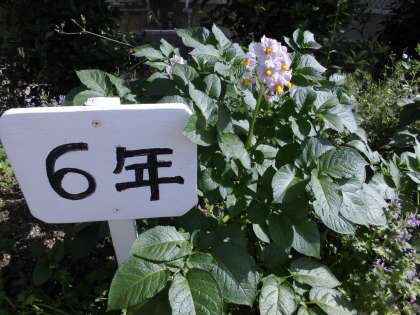 実験用に植えているジャガイモの花が咲きました。紫色の小さな花です。可愛らしい花です。
