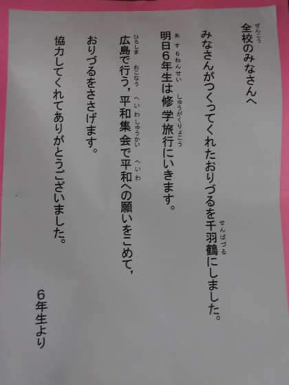 6年生が明日から,修学旅行へ出かけます。本日,詩の広場の掲示板に,千羽鶴が掲げられました。全校の子どもたちで折った千羽鶴です。6年生が代表して,平和集会で平和を祈り千羽鶴を捧げてくれます。