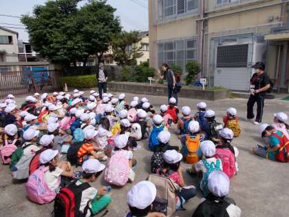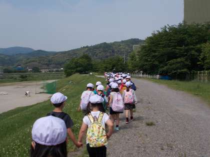 16日(水)に春の遠足に行きました。みんなで楽しみにしていた嵐山東公園への遠足,お天気もばっちり!塚本先生のお話を聞いて,いざ出発です。2列に並んで歩いて行きます。