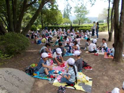 嵐山東公園に着くと,グループごとにウォークラリーを行いました。各ポイントには先生がいて,クイズや写真撮影など様々なことを行います。グループみんなで力を合わせて、クリアできました。そしてその後は楽しみにしていた,お弁当タイムです。外でお家の人に作ってもらったお弁当を,みんなで食べるのは最高でした。