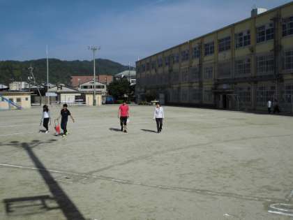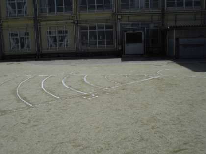 7時30分からたくさんの教職員が集まり(写真の教職員は一部です),グラウンドにラインをひきました。