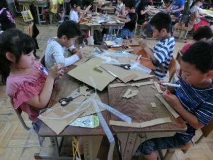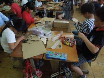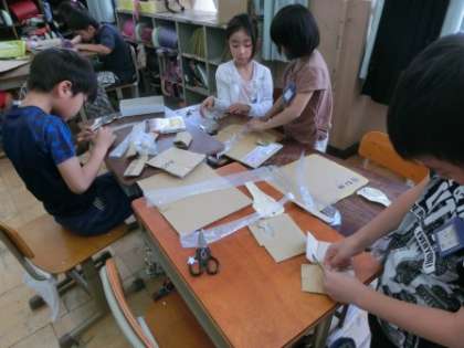図工の学習でダンボールを好きな形に切り,ひもやテープでつなげて思い思いの物を作っていました。