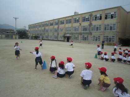 1年生は今体育の学習でリレーをしています。コーンのところでターンをして,丸いバトンを次の人にパス!上手にできるようにたくさん練習しています。
