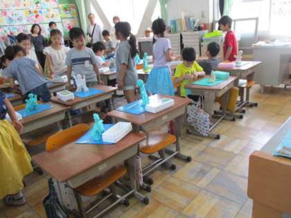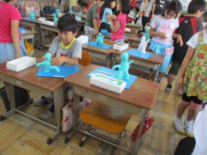 図画工作科では,にぎにぎねん土から発展させて「ぼく,わたしのガッツポーズ」を作製しました。足を開き,しっかり立っている様子,手でポーズをしている様子を作りました。ねん土べらで髪の毛を作り,目や口をひねり出すと,今にも動き出しそうな作品ができあがりました。