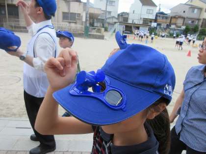 ソーラーキャップをかぶり,電気を貯めてプロペラを回す体験も行い,子どもたちは涼しそうにしていました。