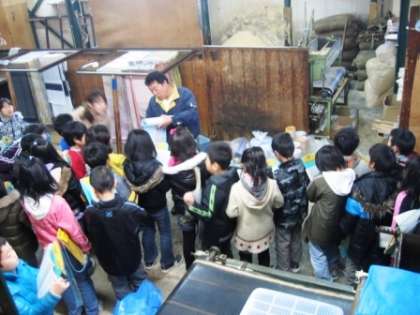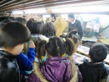 校区にある工場見学ということで,3年生が今日は二ヶ所に分かれて見学に行きました。夏山染工(蒸工場)とその近くの染め工場に行きました。