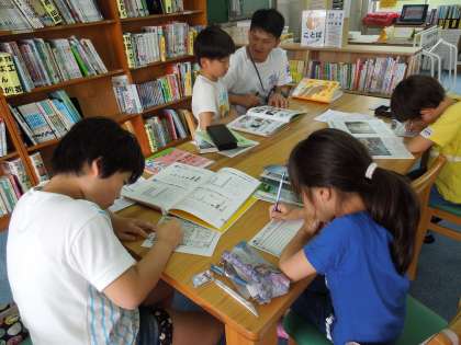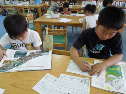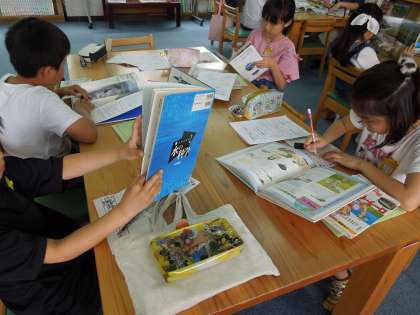 4年生は,5月中旬より,環境問題について,学習を始めています。それぞれが,自分の学習テーマを決めるたmに,本から問題点を見つけたり,先生に相談したりしながら,進めてきました。今は,それぞれが,自分のテーマのもとに資料を探し,「情報カード」に書き込んでいます。「情報カード」に書きだすと,図書館全体が静まりかえり,鉛筆を走らす音だけです。「情報カード」に書くことは,3年生から始めていますので,集中してきています。同時に,子どもたちは,静かに落ち着いて学習するよさも体全体で感じてくれています。