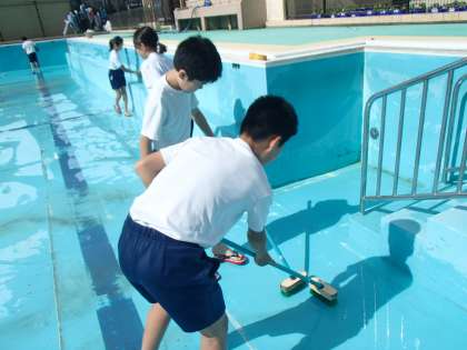 先日プール清掃が行われました。子どもたちの中には,始まる前からワクワクしているようでした。始まってみると,はじめは「うわ〜汚れてる!!」といやそうな顔を見せる子どももいましたが,掃除をしていくうちに汚いのもわすれてどんどんきれいにしてくれました。自分たちできれいにしたプールに入るのが待ち遠しいです。