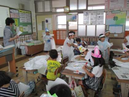 画用紙の輪に飾りをつけて,自分を楽しく変身させるための飾り作りをしました。動物を描いたり自分の好きなくだものを描いたりして,楽しく変身しました。白のビニル袋でベストを作り,変身を完成させました。自分のイメージをふくらませ,表現の楽しさを味わいました。