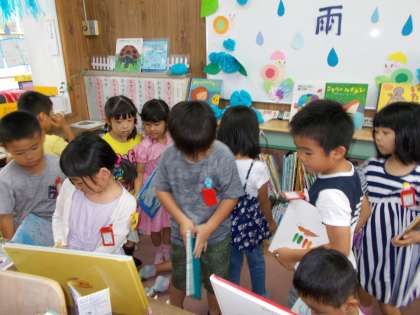 1年生もひとり1冊ずつ本をもち,正しい住所に本を戻しました。