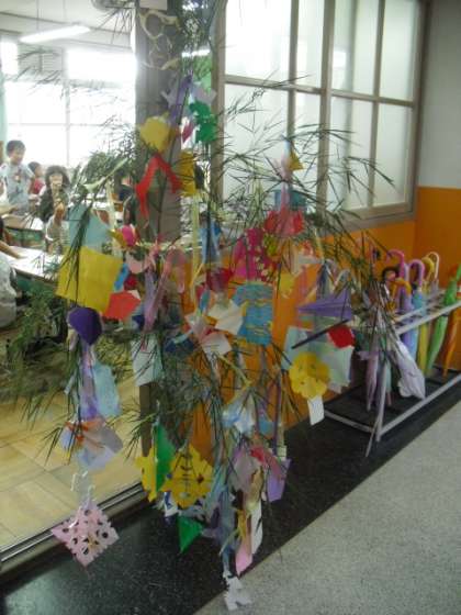 梅津小学校では、毎年学校で育てられている竹を使って、七夕の飾りつけをしています。