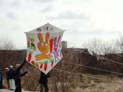 梅津小学校のむくのき学級の子ども達が描いてくれた大凧が,大空高く揚がりました。当日,むくのき学級の子ども達も参加し,大きな歓声を上げていました。