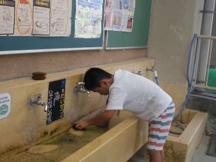 夏休み明け,渡り廊下を掃除してくれる5年生!汗をかきながら,落ち葉を掃いて美しくしてくれました!
