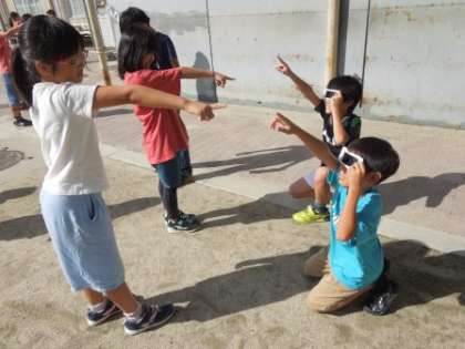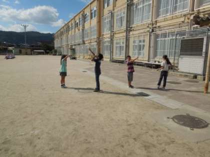 かげの向きを指さす人と太陽のむきを指さす人にわかれ,二人組で行いました。