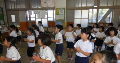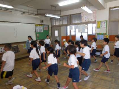 ボックスという足の動きを細かく教えてもらったり,手や首の動かし方を教えてもらったりしました。明るい曲なので,リズムにのって楽しく体操をしていました。当日が楽しみです。