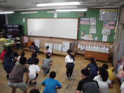 開会式で全校体操を行いますが,今年は事前にビデオをとり,4,5,6年の係の子たちが”出張”して教えに行っています。