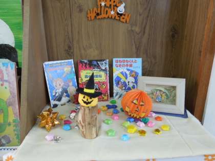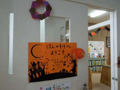 ボランティア「うめのこ」のみなさんが,こうめルームをハロウィン仕様に飾ってくださいました。ほんのもりの前を通る子ども達は,