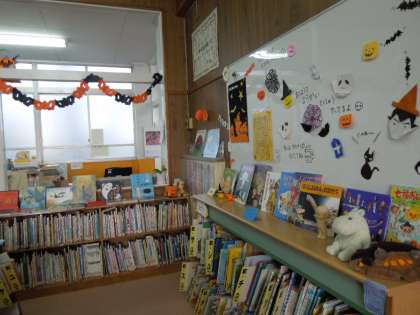 飾りの下には,「おばけ」「魔女」などが出てくる本がいっぱい並んでいます。