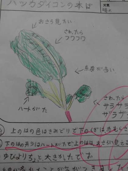 二十日大根を生活科で育てています。「小さな赤紫の大根が早くできないかな。」と成長を願いながら毎日水やりをしています。本葉が出てきたので,先日観察しました。