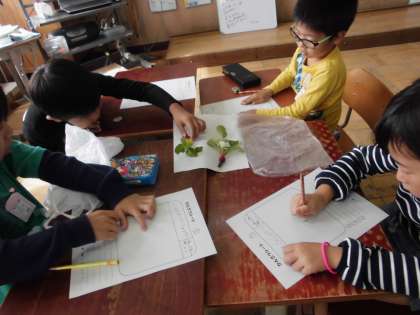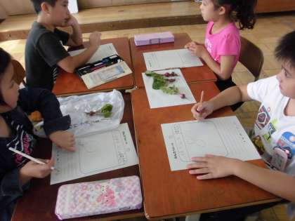 二十日大根の実もしっかり観察します。じっくり実を観察してみると多くの発見があります。二十日大根の内側の色は・・・赤紫色なのか?!収穫して食べる時が楽しみですね。