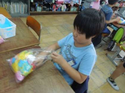 今日の図工では,袋に色々な紙をつめてカラフルな友達を作りました。