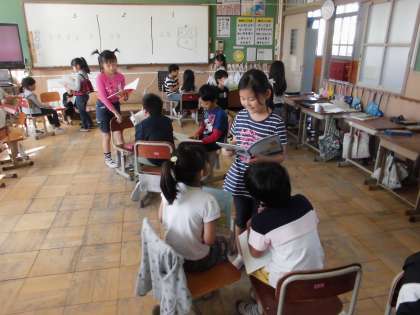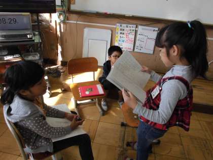 音読劇の練習に入りました。自分の読みたい文を決め,音読プランを立て,劇練習に挑みます。同じ場面の子どもたちで集まり,アドバイスをし合いながら,表現力に磨きをかけます。子どもたちは大変意欲的です。発表会が楽しみです。