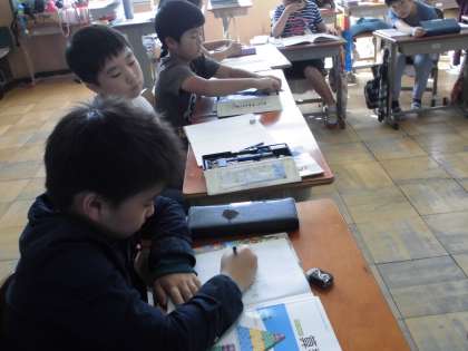 算数の学習時,真剣に考える姿が並びます。素晴らしいです。自分の考えをノートに記すことは,思考の整理にとても大切な時間です。無音の時間は集中力の高まりを表します。