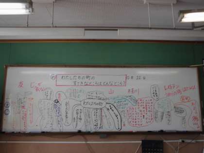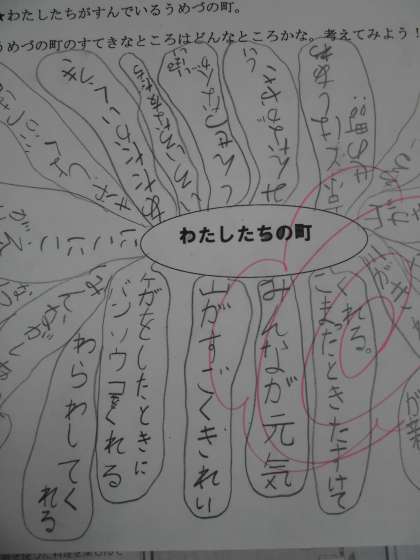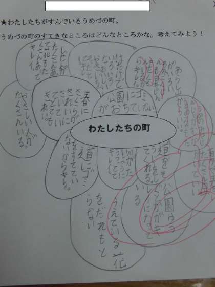わたしたちのすむ町(京都市・梅津)は魅力がたくさんあります。生活科の学習では,町の魅力に迫っていこうと思います。今日は1回目です。子どもたちが思っている「わたしたちの町のすてきなところ」を集めてみました。今週末は,お家の方が思うすてきなところをお伺いしたいと思います。宿題のインタビューにご協力してください。よろしくおねがいします。
