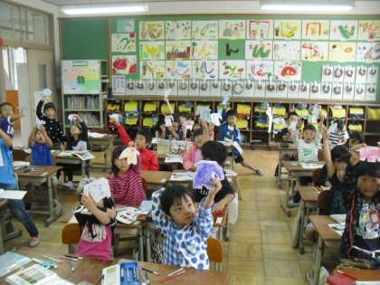紙を半分に折って、立つ仕組みを使って、ゾウを作りました。次回は、想像を広げ、いろいろな動物、乗り物、建物を作り、楽しい街をクラスのみんなで作りたいと思っています。