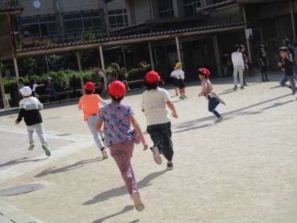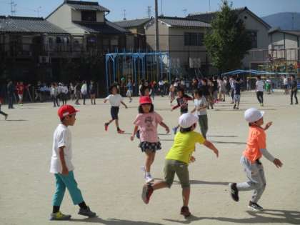 係活動に意欲的に取り組んでいます。中間休みに,遊び係の人が計画した「ふえおに」をしました。はじめは,遊び係がおにになり,タッチしたら,どんどんおにが増えていきます。運動場の隙間をぬって逃げたり追いかけたりしながら,楽しく遊んでいます。