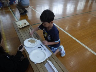 どのクラスも全力で大豆をつまんでいました。勝ち負けだけではありませんが,やはり勝ちたい気持ちから,緊張や焦りもありつまんだ豆が落ちてしまう場面もありました。
